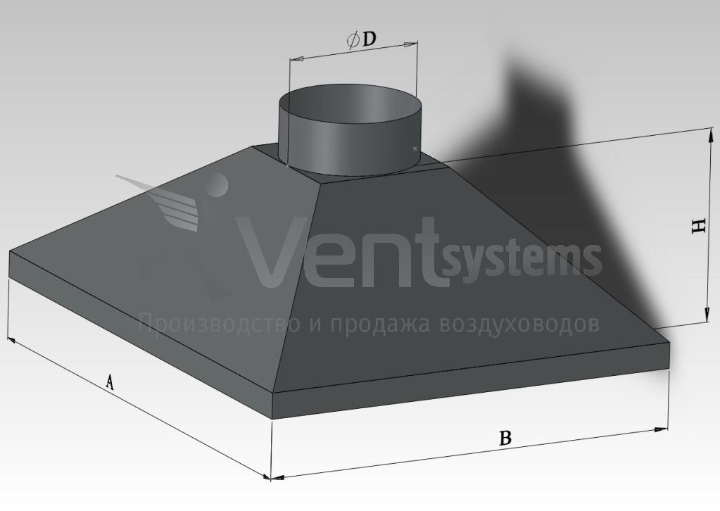 Вытяжной зонт изготавливается из металла. Конструктивно он представляет собой открытый снизу короб, подсоединенный к вытяжному воздуховоду. Такие зонты могут работать и при естественной, и при принудительной вентиляции.