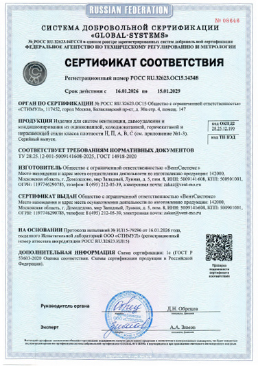 Качество продукции — приоритет завода «ВентСистемс». Все выпускаемые изделия соответствуют требованиям ГОСТ 14918-2020 и собственных Технических условий ТУ 28.25.12-001-5009141608-2025. Наше производство прошло процедуру обязательной и добровольной сертификации, что подтверждает безопасность и надежность вентиляционных систем.