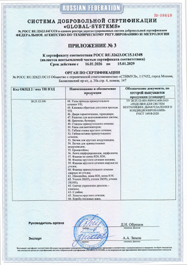 Согласно сертификату, завод «ВентСистемс» производит следующую номенклатуру изделий для систем вентиляции, дымоудаления и кондиционирования: